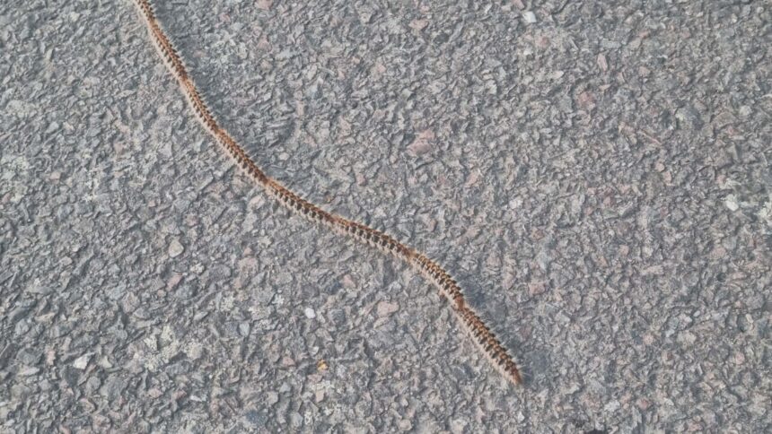 On peut les apercevoir en file indienne, quittant leurs cocons de soie installés dans les arbres pour s’enfouir dans le sol avant leur métamorphose.